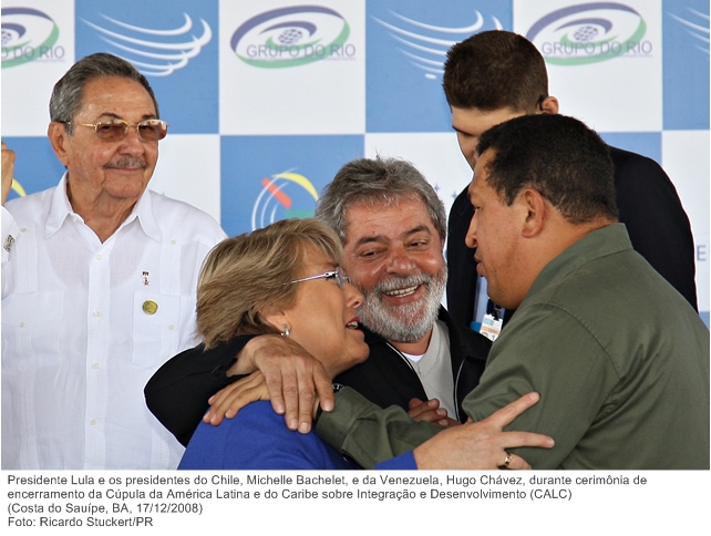 Presidente Lula e os presidentes do Chile, Michelle Bachelet, e da Venezuela, Hugo Chávez, durante cerimônia de encerramento da Cúpula da América Latina e do Caribe.
