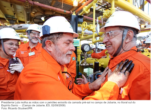 Presidente Lula molha as mãos com o petróleo extraído da camada pré-sal no campo de Jubarte, no litoral sul do Espírito Santo.